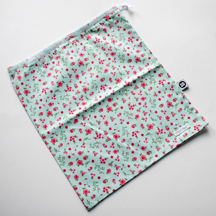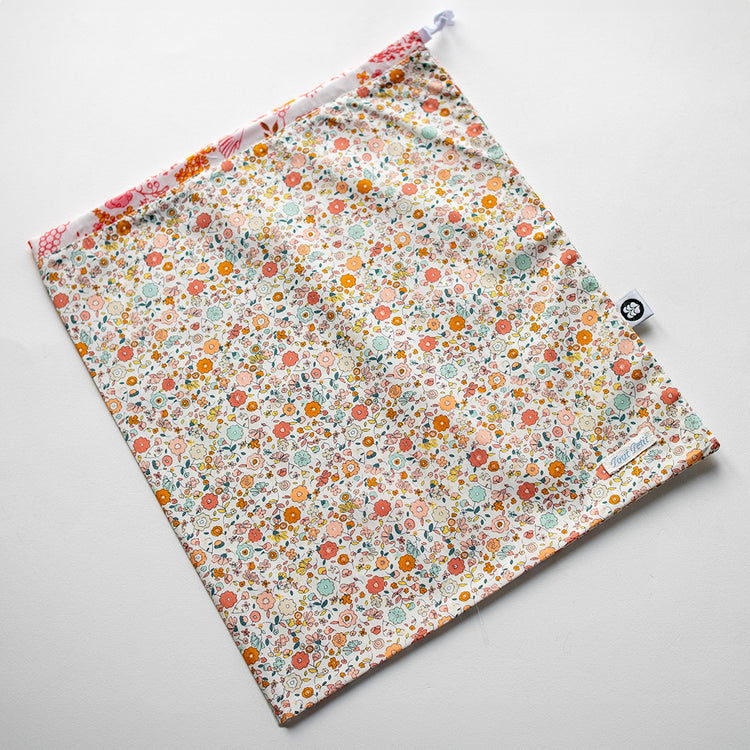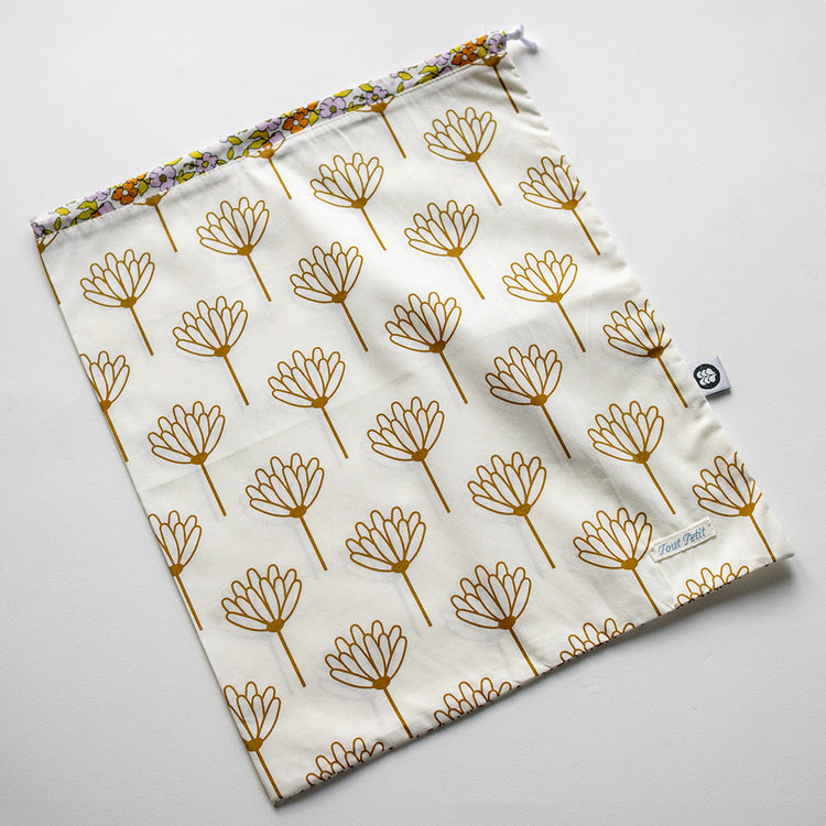 Denne smukke string-bag er syet på Ærø af Sophie fra Tout Petit Atelier. Hver pose er helt unik i sin sammensætning af farver og mønstre og syet i de fineste Liberty-stoffer kombineret med smukke bomuldsstoffer.