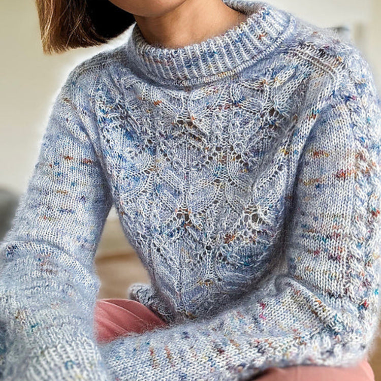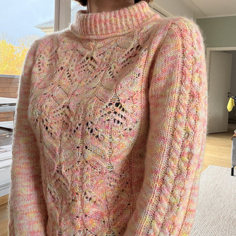 Marlin Sweater strikkes oppefra og ned uden sammensygninger i siderne. Den har en elegant drop-shoulder-kontruktion og smukt kabelmønster på ærmerne.