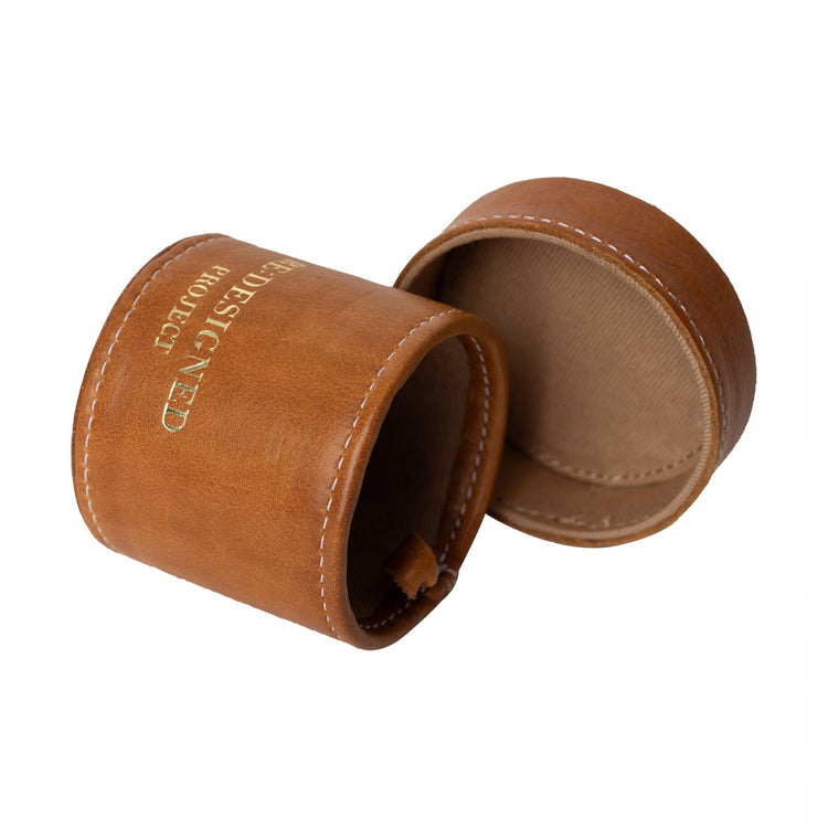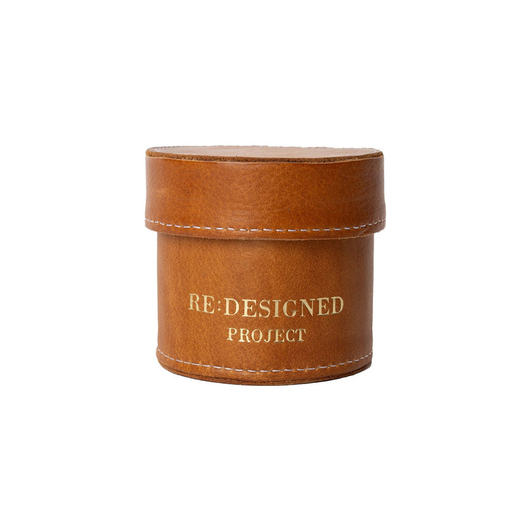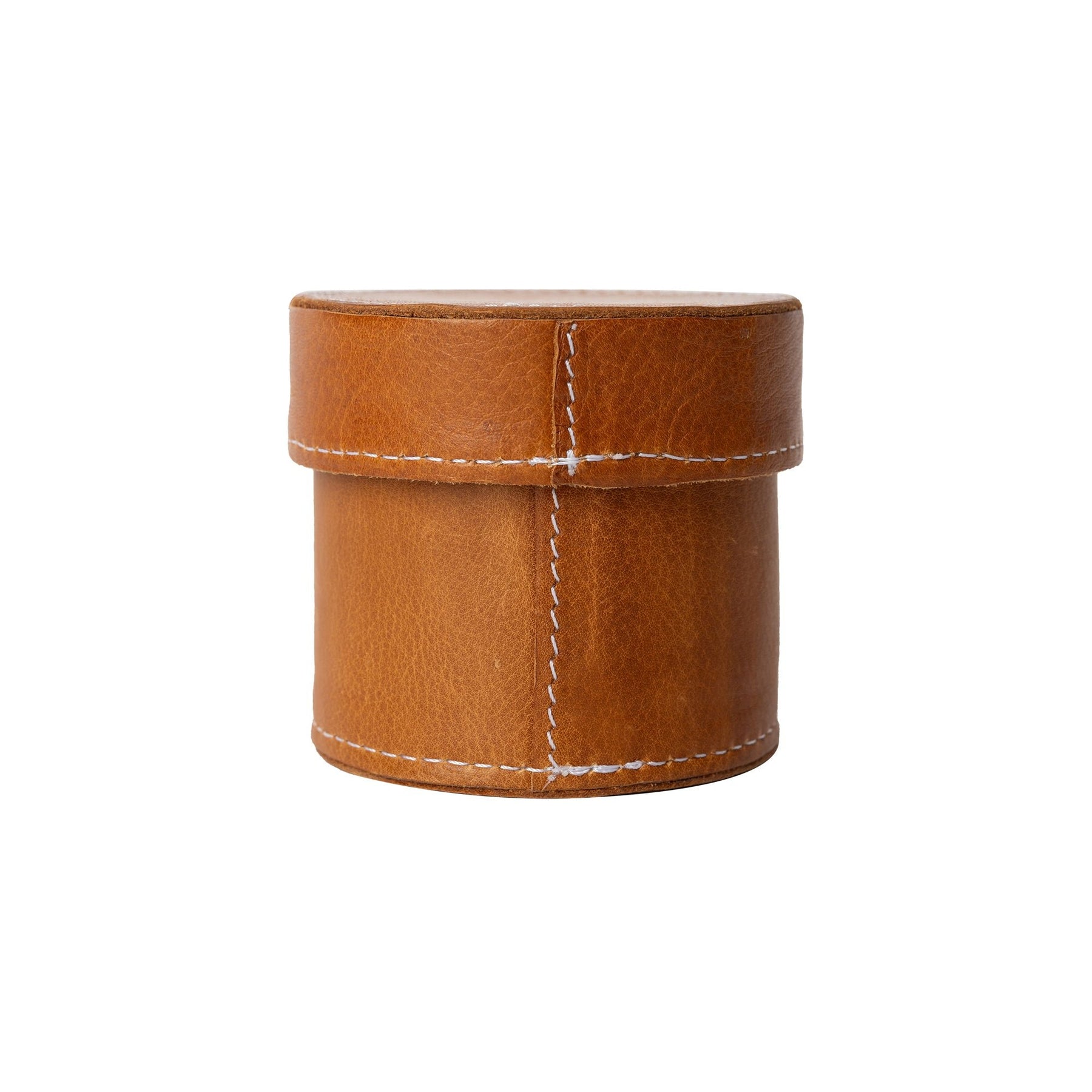 En smuk og funktionel lille læderbeholder, der lukkes med låg, så dine små redskaber forbliver sikkert samlet – både derhjemme og på farten.