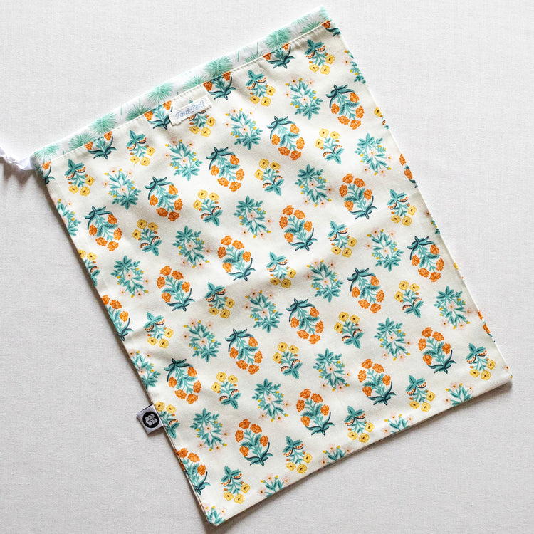Denne smukke string-bag er syet på Ærø af Sophie fra Tout Petit Atelier. Hver pose er helt unik i sin sammensætning af farver og mønstre og syet i de fineste Liberty-stoffer kombineret med smukke bomuldsstoffer.