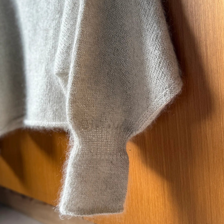 Vi strikker Volare Blouse i 1 tråd Nobilis 1 - 100% superfine, blød, kradsefri lammeuld fra Skotland sammen med 1 tråd Cava - en blød og dunet silkmohair fra Italien.